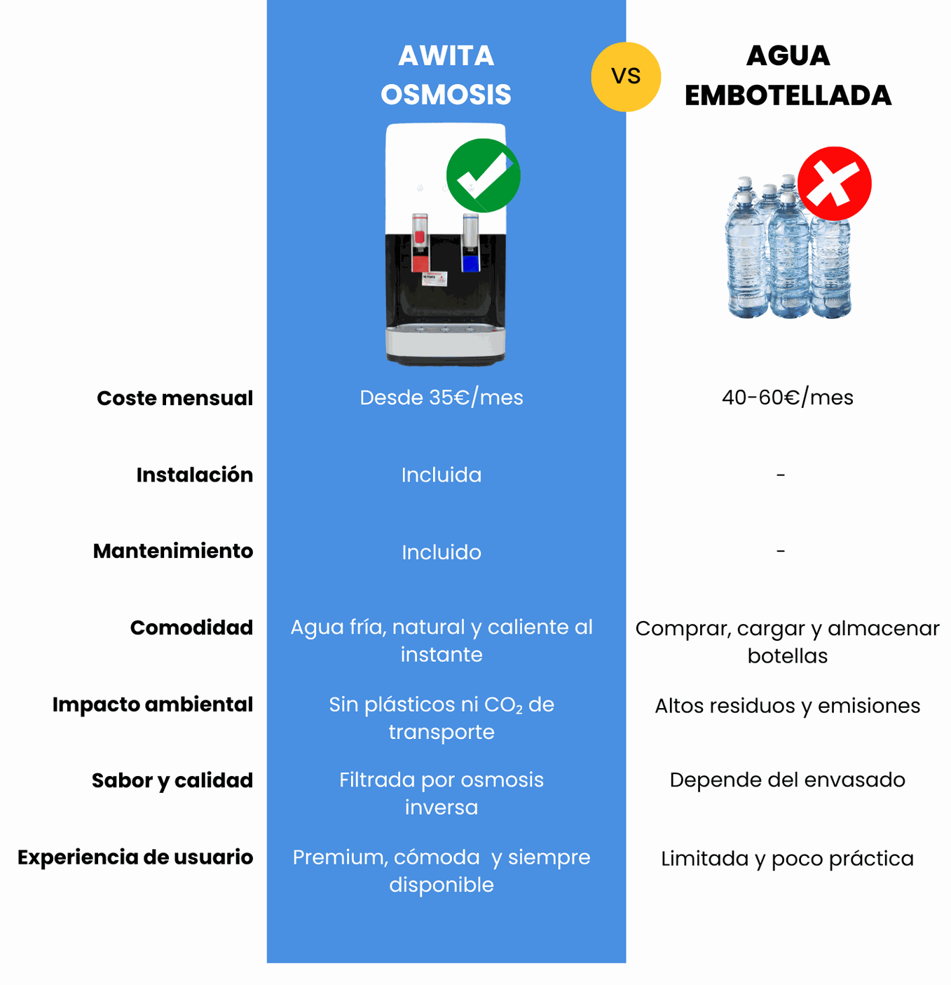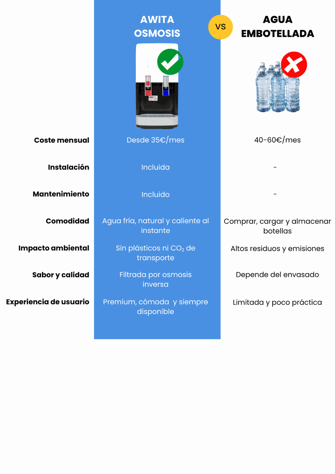 Agua filtrada por osmosis inversa, siempre disponible. Fría, natural o caliente cuando la necesites.